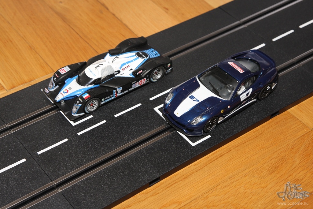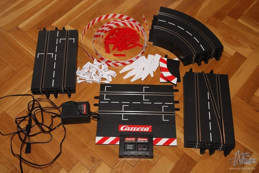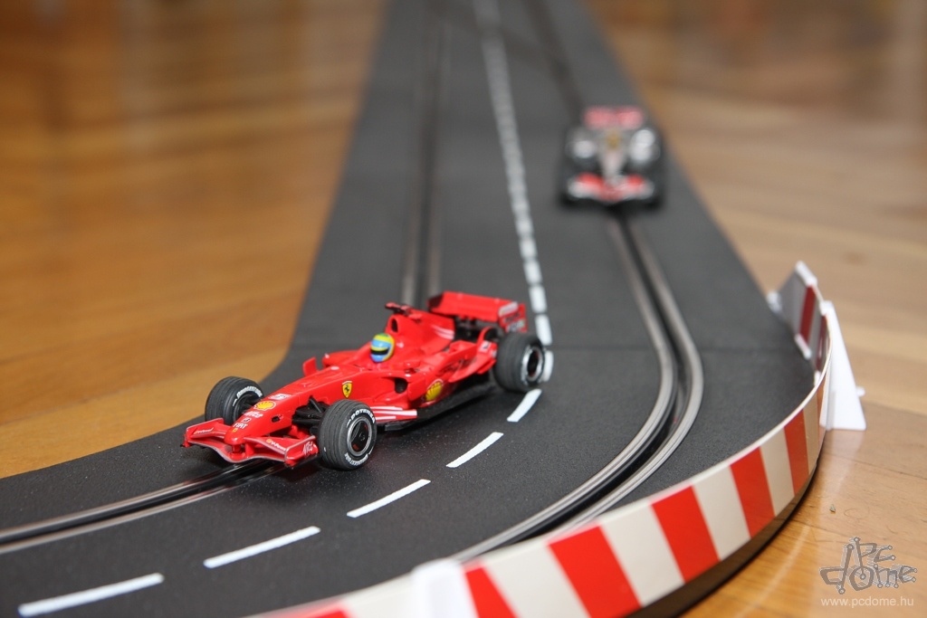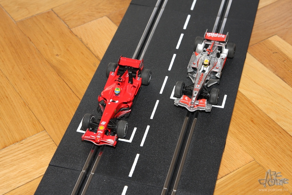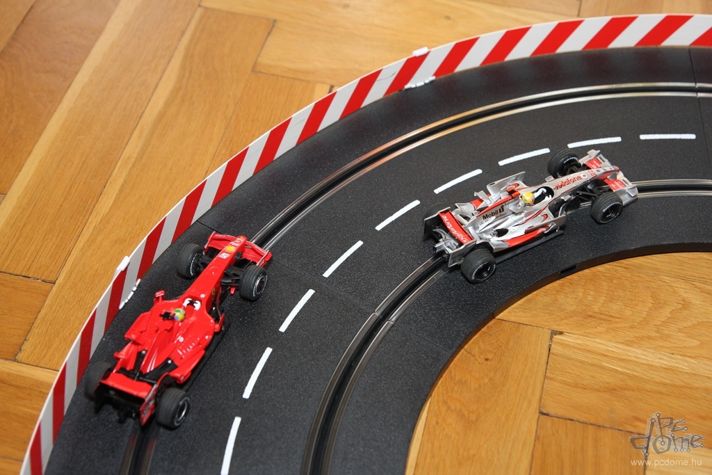 A tesztre kapott készletből egyfajta nyomvonal összeépítésére kaptam javaslatot a leírásban, nem is kísérleteztem mással. Számos különböző doboz létezik amúgy, ezekben más és más pályarajzolat és más autók találhatók. De mindenből vehetünk külön is: a Carrera katalógusa rengeteg autót tartalmaz, és természetesen a pályaelemekből is bármelyiket megvehetjük külön. Tavaly például a forgalmazó munkatársai a Hungaroring nyomvonalát alkották meg Carrera elemekből. A gyártó weboldalán pedig különböző autóversenypályák vonalvezetési rajzát és a hozzájuk szükséges elemek listáját is megtalálhatjuk. A már említett, egy- vagy kétirányú sávváltón kívül pedig olyan speciális részeket is vásárolhatunk, mint például a körszámláló vagy a boxutca. Az utóbbi használatakor időnként be kell hoznunk autókat a boxba, hogy feltöltődjön ismét virtuális üzemanyaggal, ezzel is tovább színesítve a játékot.