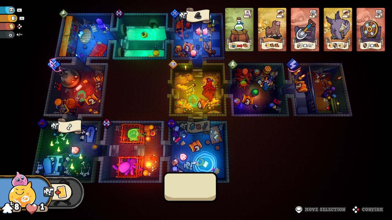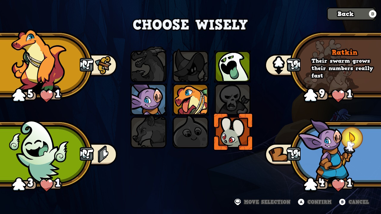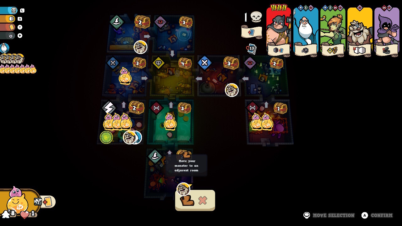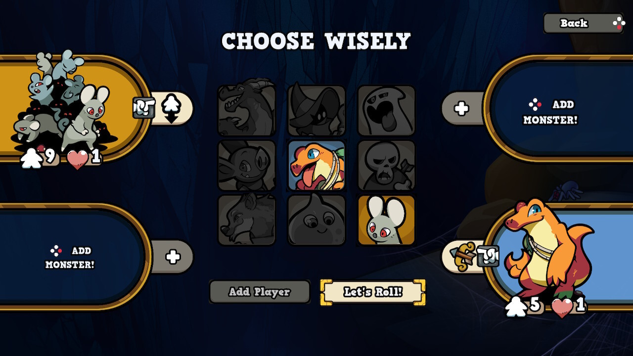 Az eredeti 9 szörnyecske lesz kezdetben választható, viszont a pályákat itt most csak sorban lehet játszani, nem kezdhetünk a későbbi szinteken. Annyit nem sikerült tolnom, hogy rájöjjek, mikor nyílik meg a 3 extra szörny vagy a meeple-skinek, de mentségemre szóljon, hogy nem egyszerű a stuff. Az első szintet többször is teljesítettem más-más emberekkel, akiknek bemutattam, miről is szól a videojáték-átirat (velük már volt alkalmam a táblás verzióhoz korábban), aztán egyedül folytattam az utamat a későbbi szinteken. De hogy is működik a játék?