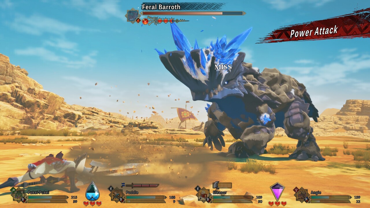 Vörös, békafejű repülő gyíkom már igazi apex predátor, érdemes lenne elkezdeni harcolni. A csaták változtak talán a legkevesebbet az előző részekhez képest, talán azért, mert mindig is ez volt a legkiforrottabb része az MH Storiesnak. JRPG-ről van szó, a kiválasztott akció után mindenki saját körében hajtja azt végre. A széria egyik névjegye a kő-papír-ollószerű rendszer – tehát ha kitaláljuk ellenfelünk lépését, amivel minket céloz, akkor jól megjárja. Az erő támadásokat legyőzi a gyorsaság, a gyorsaságot a technika, utóbbit pedig az erő. Ezen kívül a szörnyek végtagjai és gyenge pontjaik külön célozhatóak, amelyek levágásával meg betörésével a szörny elveszítheti egy ikonikus támadását vagy kifáradhat stb. Szegény Tobi-Kadachi villámokat szór, ezért nem szereti a vizet, a feje meg a kalapácsot, ha ezt a kettőt kombináljuk, akkor gyorsan padlótfog. Most is fontos együtt dolgozni MI irányította ranger bajtársainkkal, akik szerintem sokat fejlődtek, és jóval hasznosabbnak tűntek az előző részekhez képest. Mindegyikük saját mellékküldetéseiken keresztül ismerhető meg és személyre szabható.