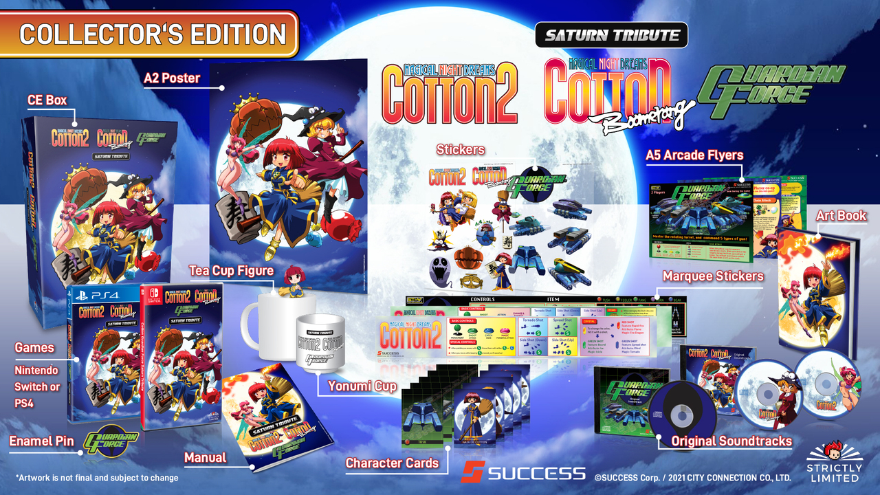 A Strictly Limited Games kiadásában Switchre és PlayStation 4-re dobozos formában megjelenő Cotton Guardian Force Saturn Tribute október 17-én éjféltől lesz előrendelhető, és a Cotton 2, Cotton Boomerang és Guardian Force játékokat tartalmazza.